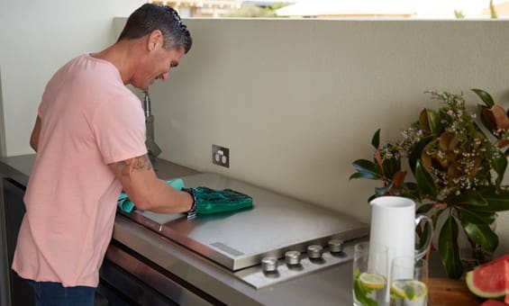 Make sure the inside of the barbecue is dry before moving on to the outside. Wet your Outdoor Glove or spray water directly onto the outside of your barbecue.